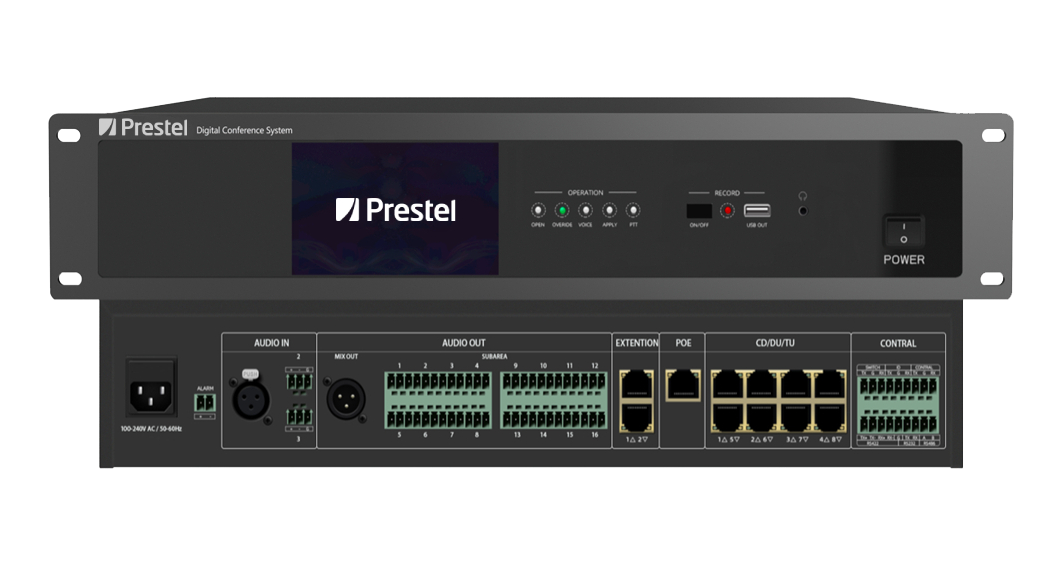 Пульт цифровой конференц-системы с высокочувствительным конденсаторным микрофоном позволяет эффективно принимать голос с расстояния до 60 см и передавать его в цифровом виде с частотой дискретизации 48 кГц в частотном диапазоне 30 Гц – 20 кГц, а системный DSP оснащён автоматической регулировкой уровня, эквалайзером, подавлением окружающего шума, эхоподавлением. На основном дисплее может отображаться логотип, информация об участнике, таймер выступления, дополнительные сервисы, календарь, а также информация о ходе и результатах голосования и другое.